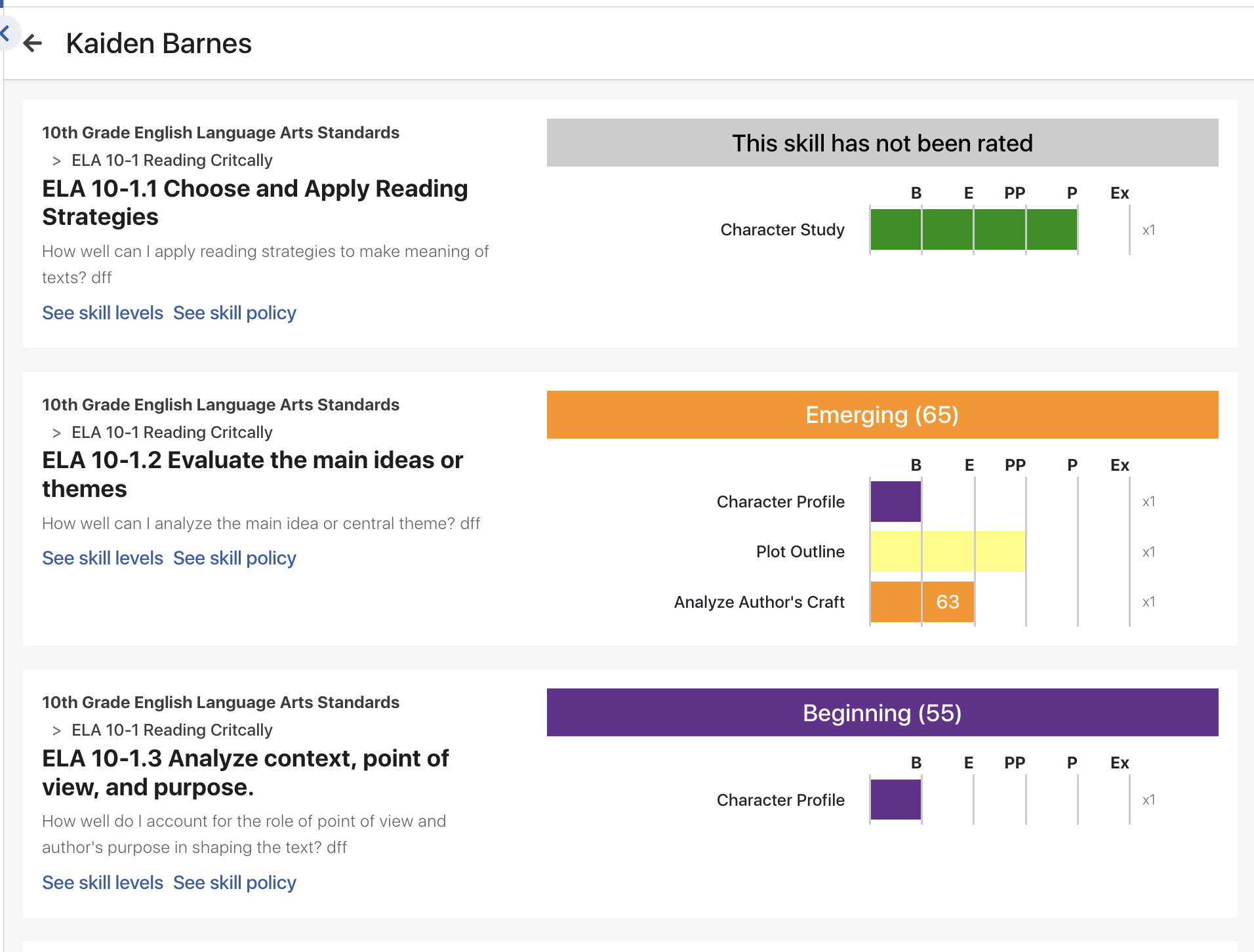 Many teachers have found the Learner Portfolio Detail view to be a helpful visual tool for Parent Conferences. If you are not yet familiar with it, you can find it by clicking on the eyeball icon next to each Learner's name in your Classes > Portfolio view. In one scrolling view, you see each Skill Portfolio, with its description, rating and any evidence it contains