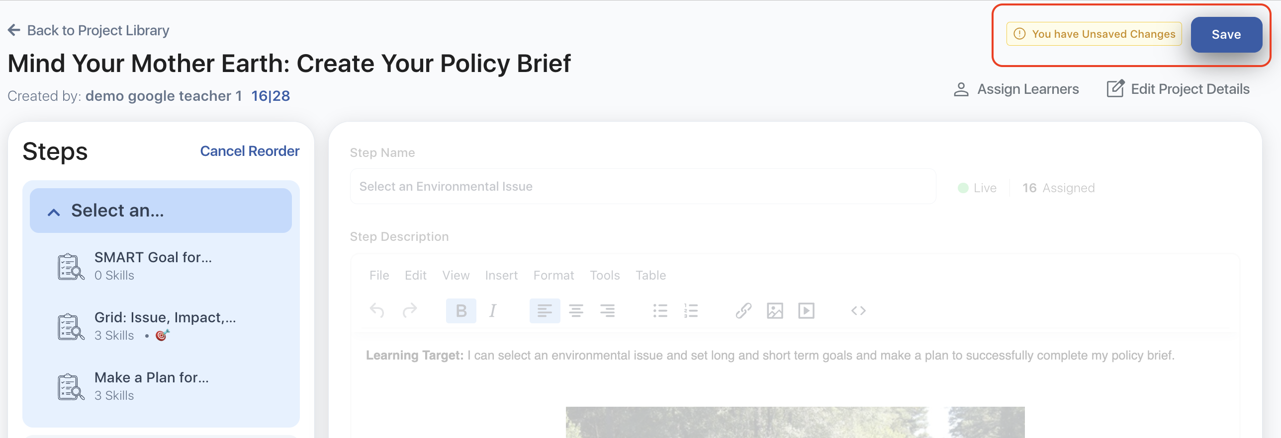 As soon as you make a change, you will see that you have unsaved changes. To save your re-ordering and return to the Project Builder, click on the Save button.