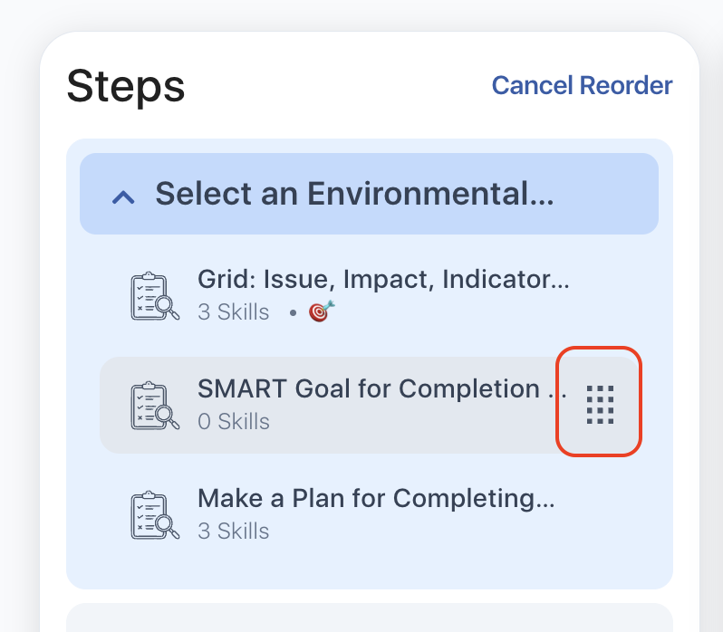 As you hover to the right of each step and evidence, you will see a grab icon to move that element.