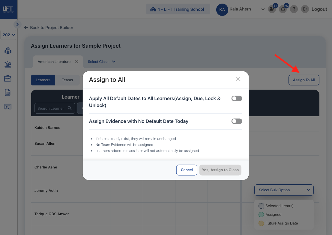 In Assign Learners, when you first select a class, or click on the new Assign To All button, a pop-up will open offering you two options.