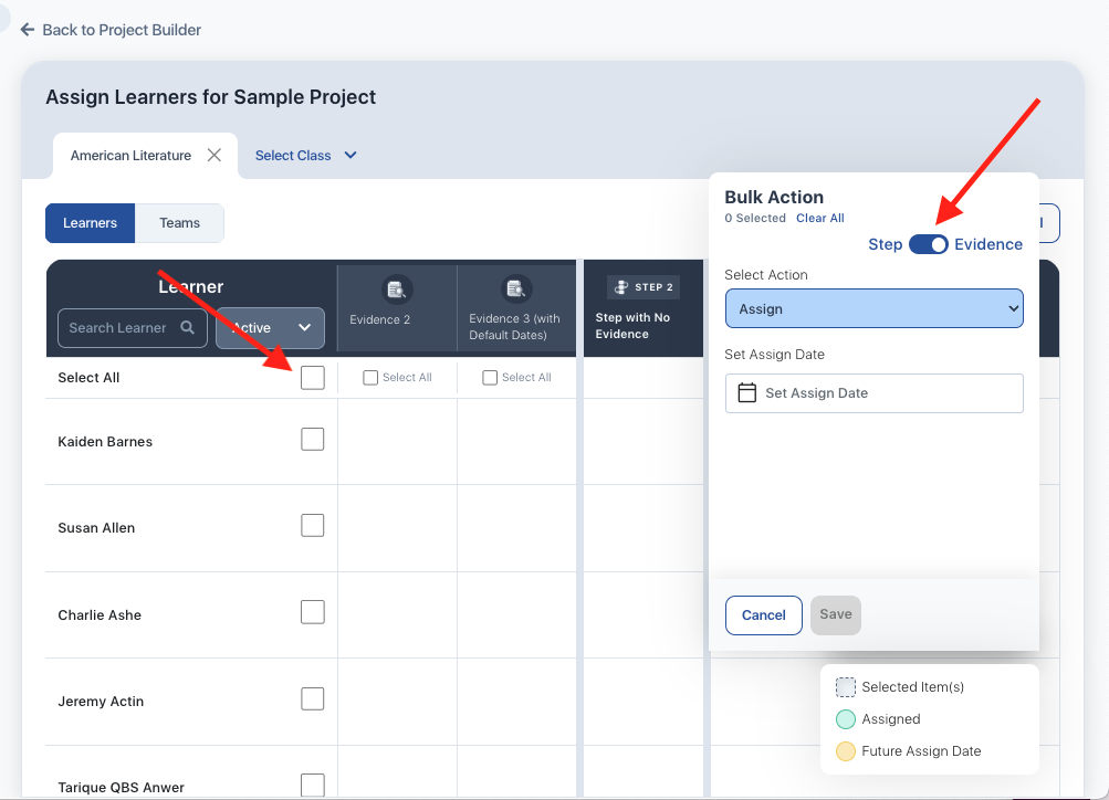 - You now have a toggle in the upper right corner of your bulk action window. It defaults to evidence and provides the opportunity to select columns for evidence or skill ratings. If you move the toggle to Step, it will instead offer the opportunity to select columns for steps with no evidence. This works for Assign, Unassign and Manage Dates.